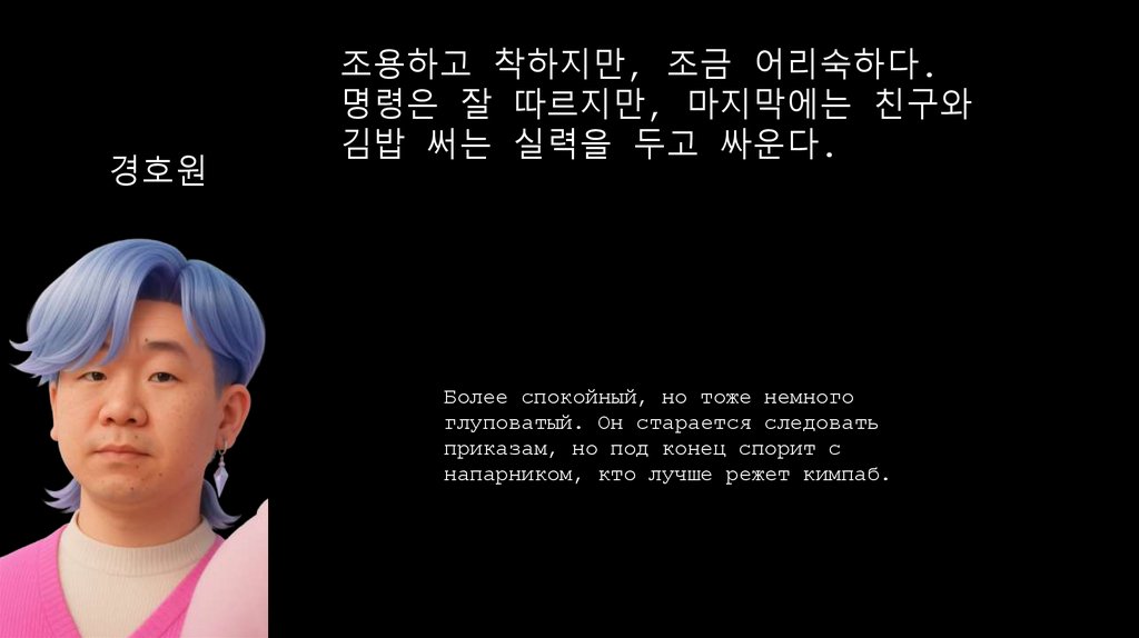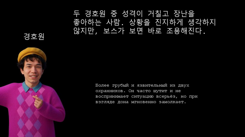 경호원조용하고 착하지만, 조금 어리숙하다.
