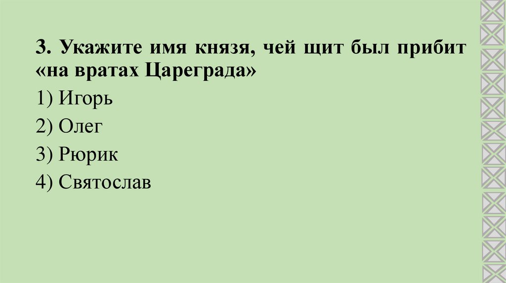3. Укажите имя князя, чей щит был прибит«на вратах Цареграда»