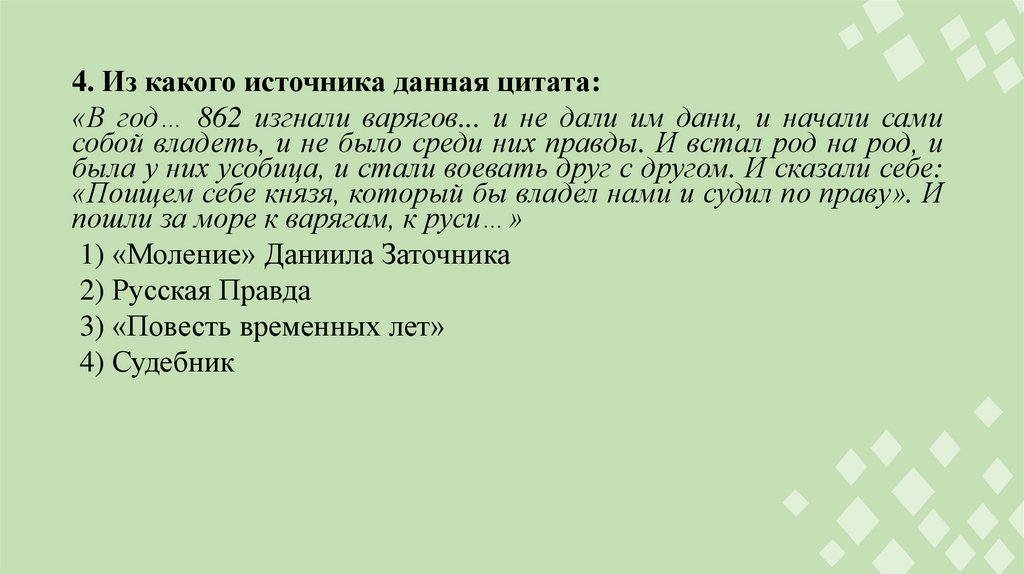 4. Из какого источника данная цитата:«В год… 862 изгнали варягов... и не дали им дани, и начали сами