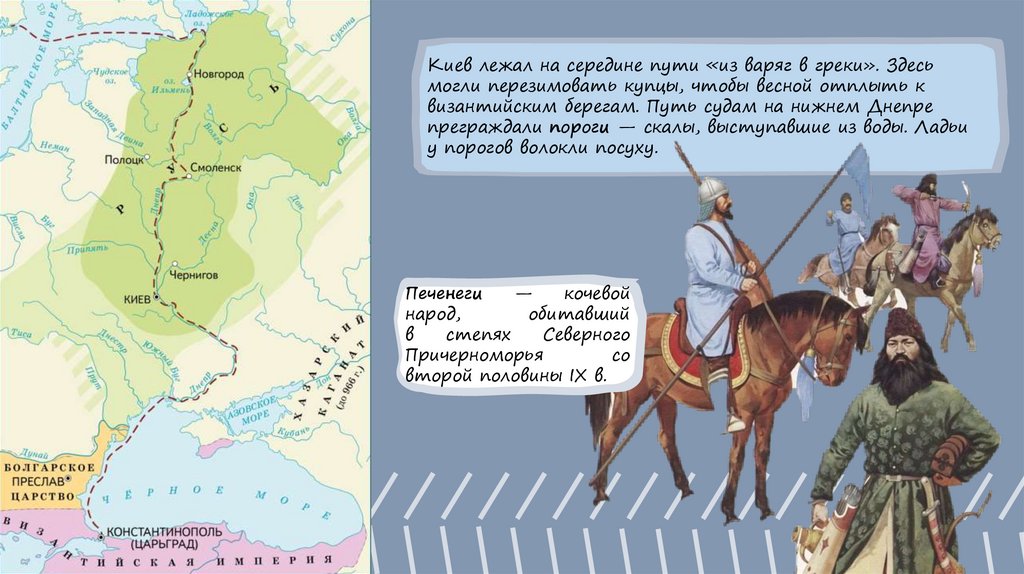 Киев лежал на середине пути «из варяг в греки». Здесьмогли перезимовать купцы, чтобы весной отплыть к