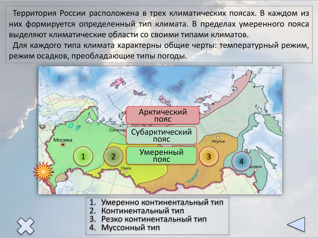 Территория России расположена в трех климатических поясах. В каждом изних формируется определенный тип климата. В пределах умеренного пояса
