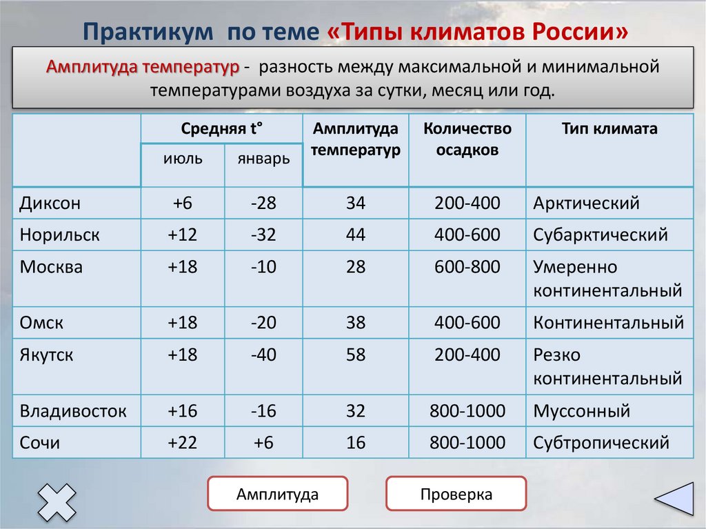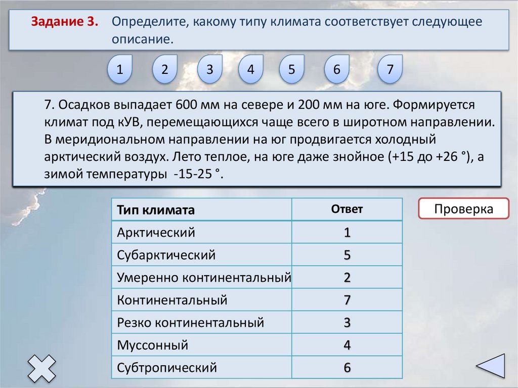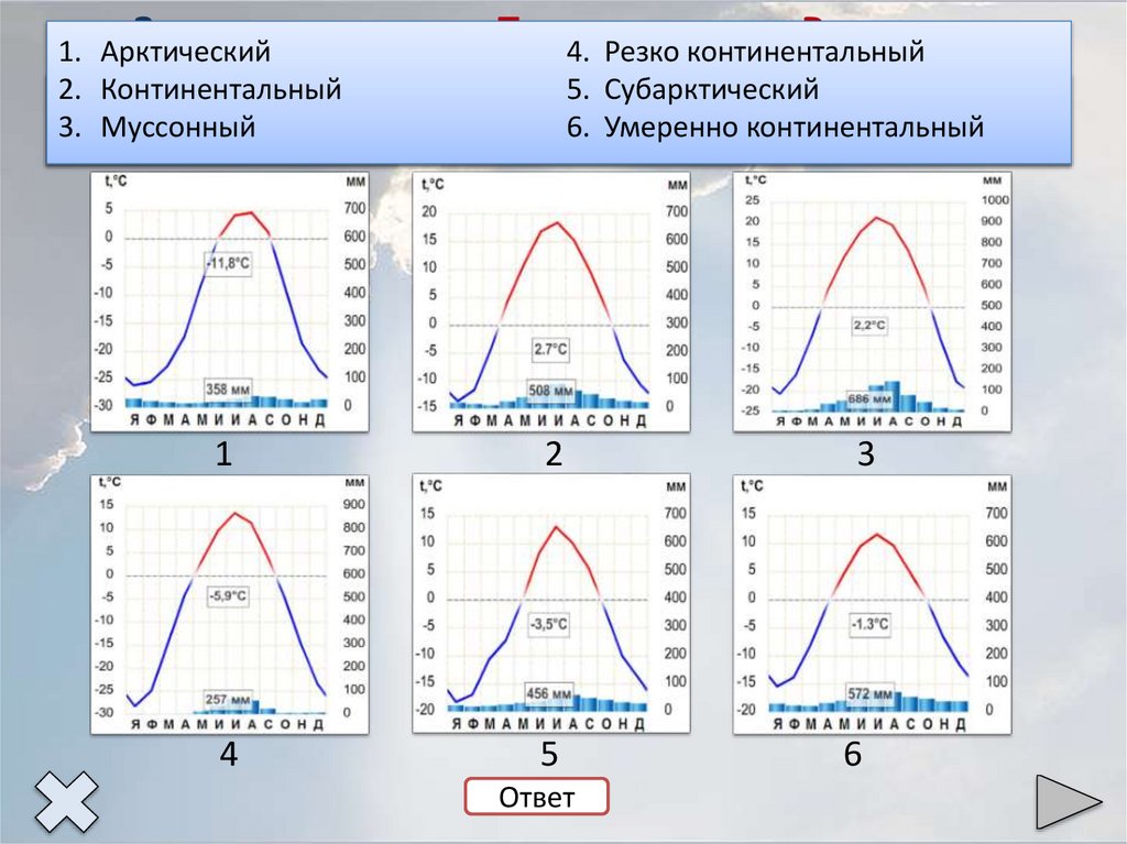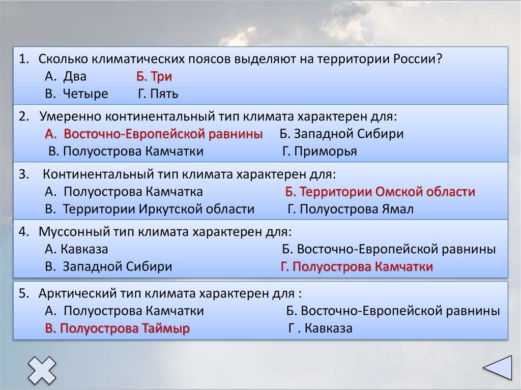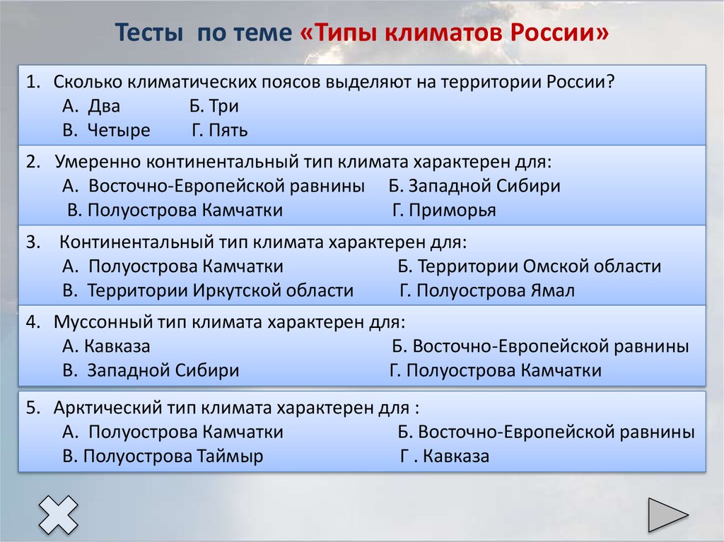 Тесты по теме «Типы климатов России»1. Сколько климатических поясов выделяют на территории России?