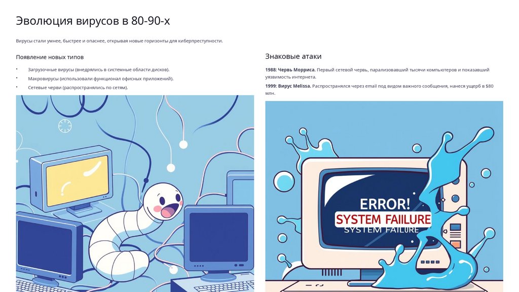 Эволюция вирусов в 80-90-хВирусы стали умнее, быстрее и опаснее, открывая новые горизонты для киберпреступности.