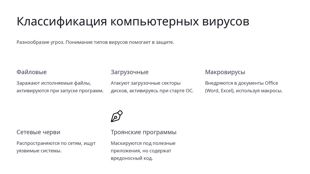 Классификация компьютерных вирусовРазнообразие угроз. Понимание типов вирусов помогает в защите.