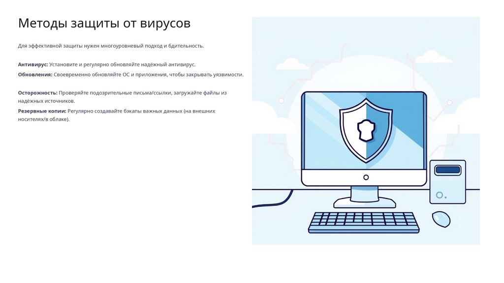 Методы защиты от вирусовДля эффективной защиты нужен многоуровневый подход и бдительность.