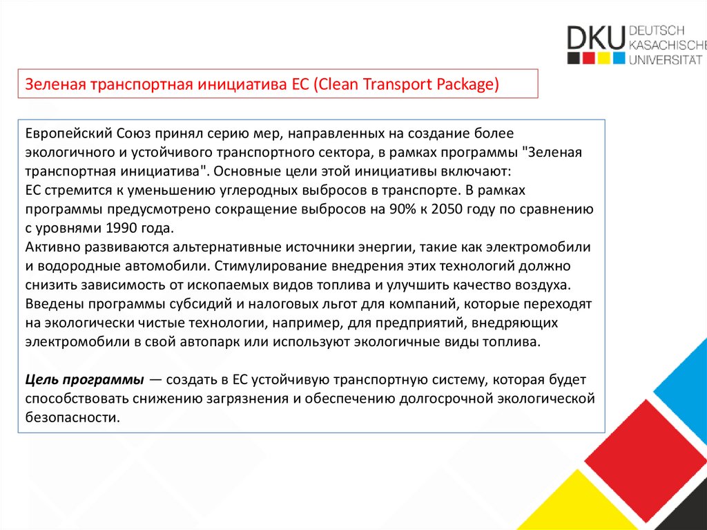 Зеленая транспортная инициатива ЕС (Clean Transport Package)Европейский Союз принял серию мер, направленных на создание более