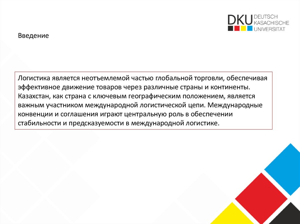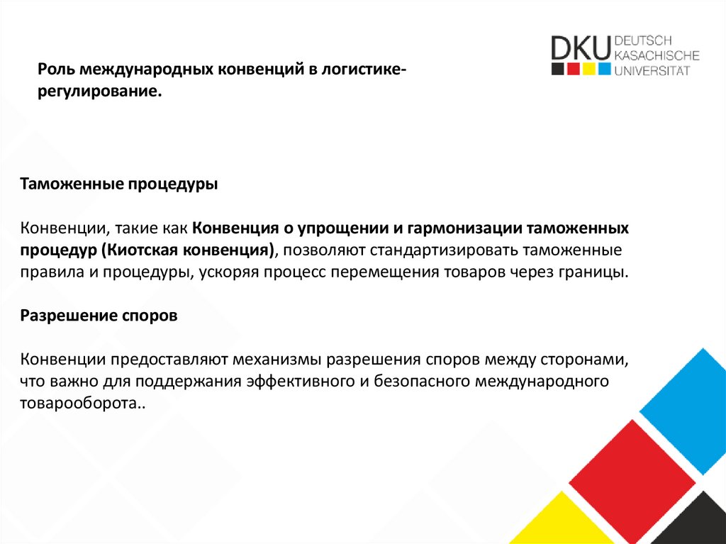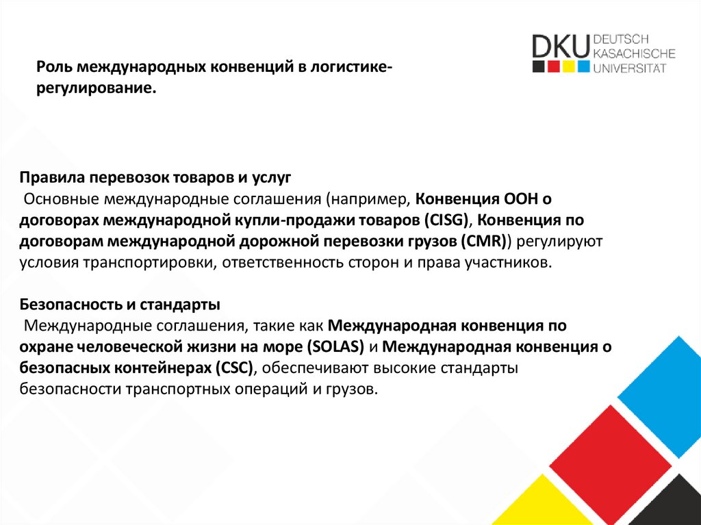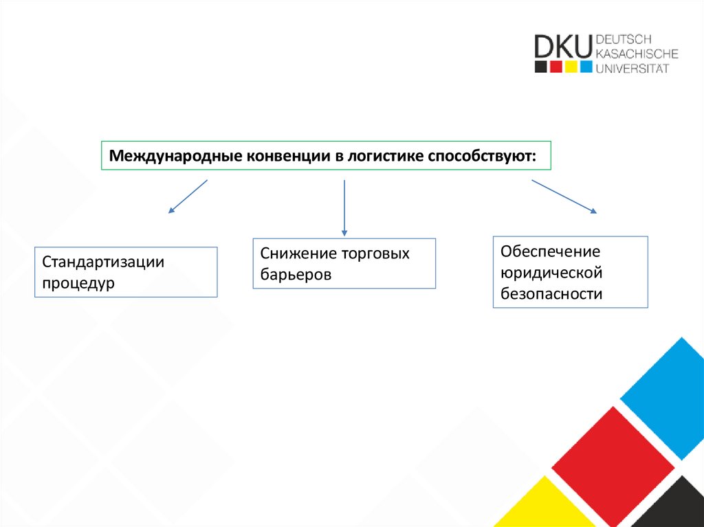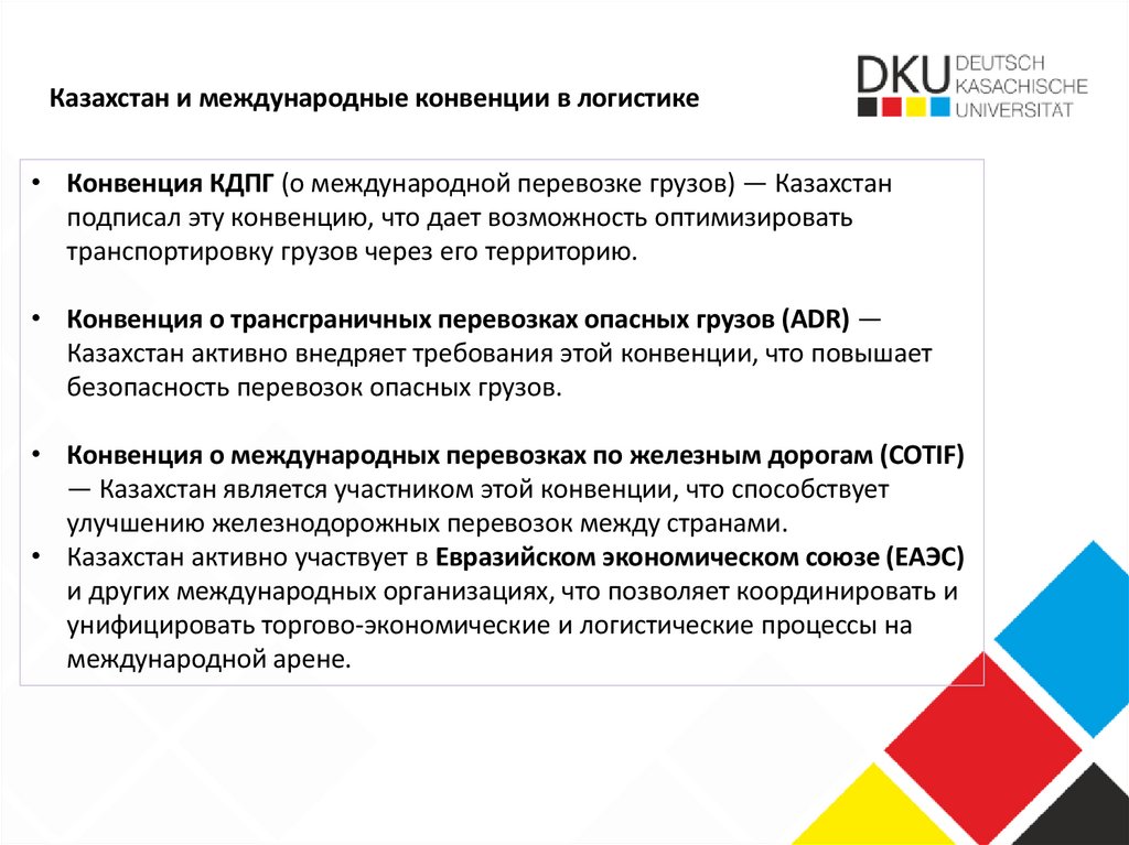 Казахстан и международные конвенции в логистике• Конвенция КДПГ (о международной перевозке грузов) — Казахстан