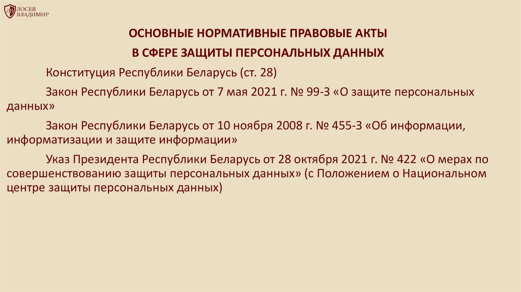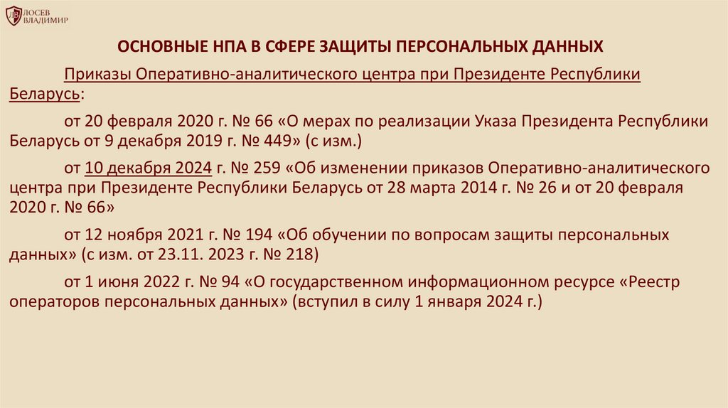 ОСНОВНЫЕ НПА В СФЕРЕ ЗАЩИТЫ ПЕРСОНАЛЬНЫХ ДАННЫХПриказы Оперативно-аналитического центра при Президенте Республики