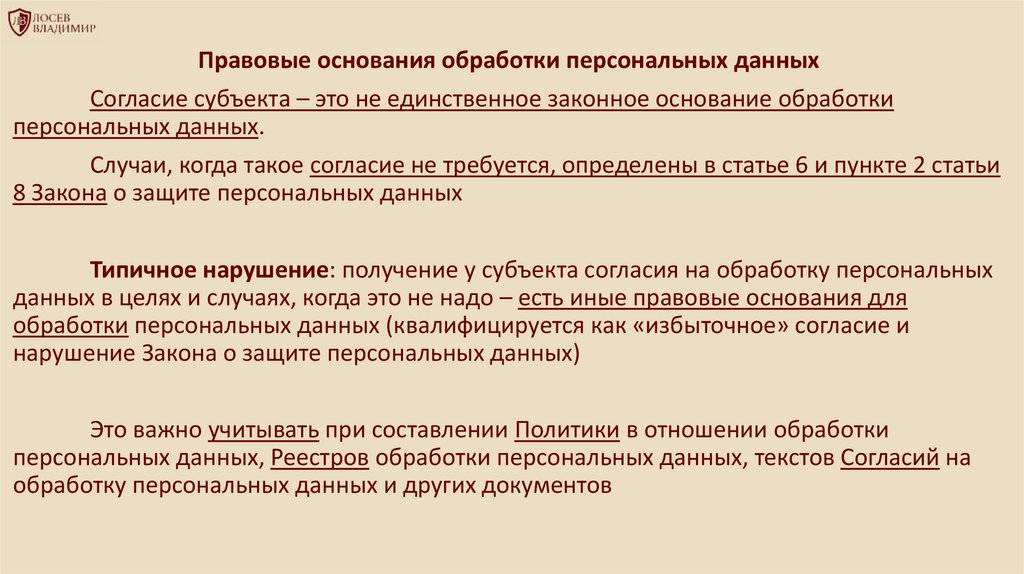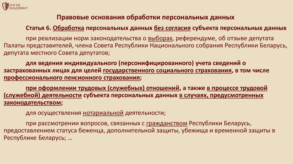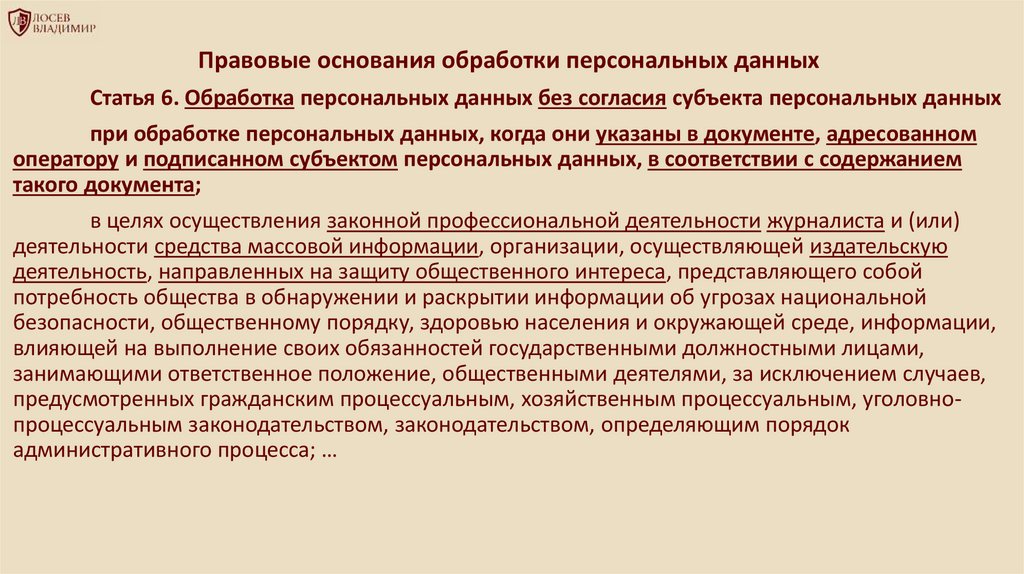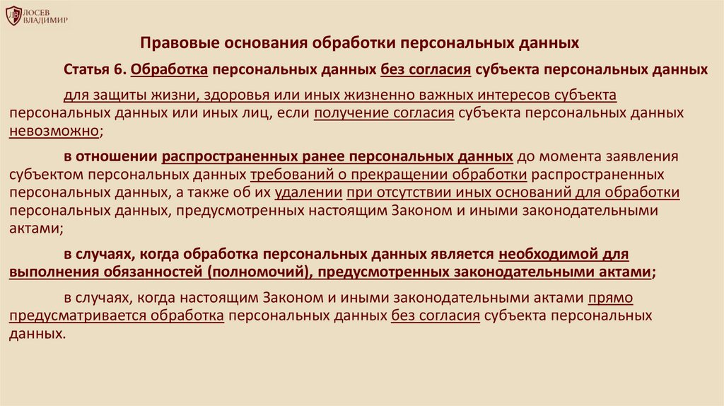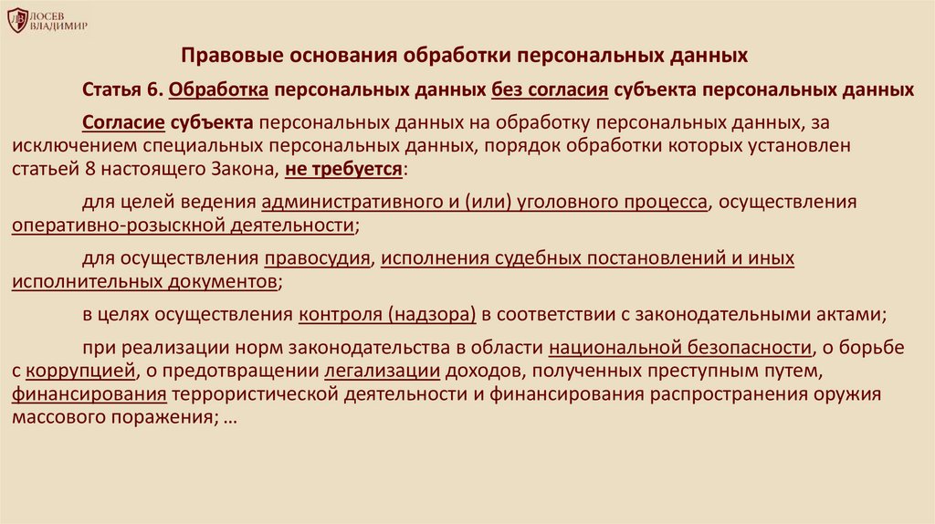 5. Правовые основания обработки персональных данных (без согласия субъекта;