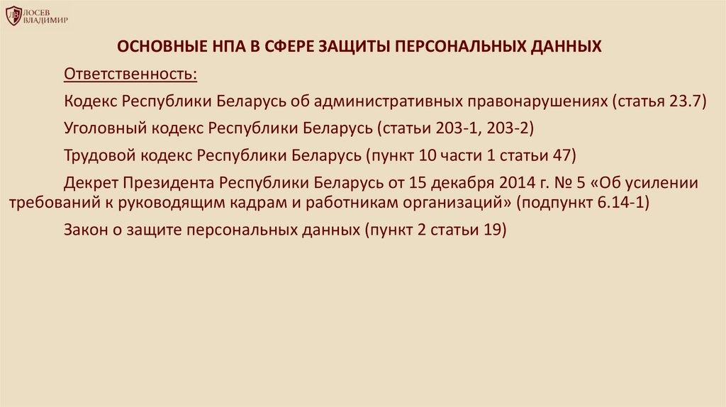 ОСНОВНЫЕ НПА В СФЕРЕ ЗАЩИТЫ ПЕРСОНАЛЬНЫХ ДАННЫХОтветственность: