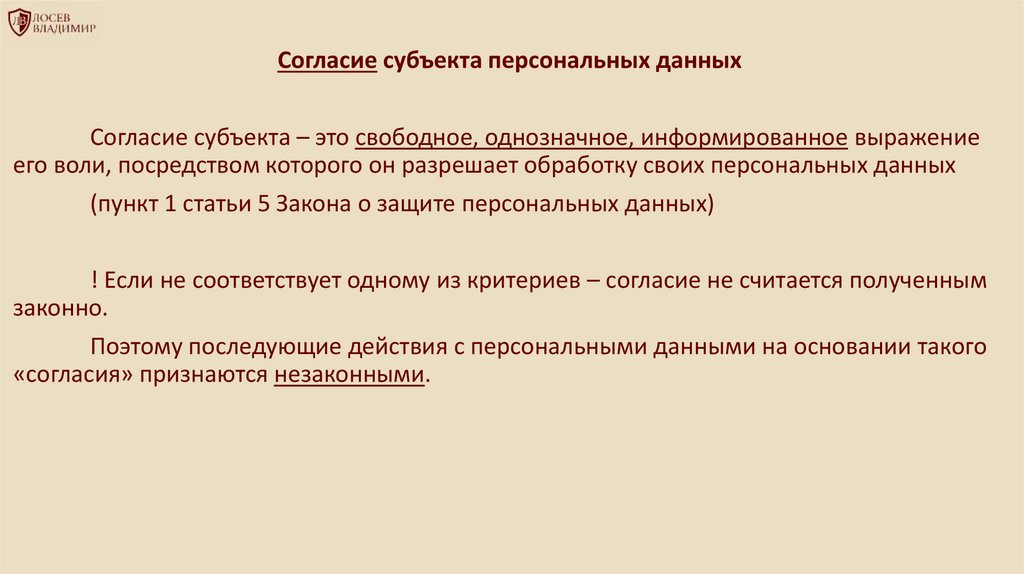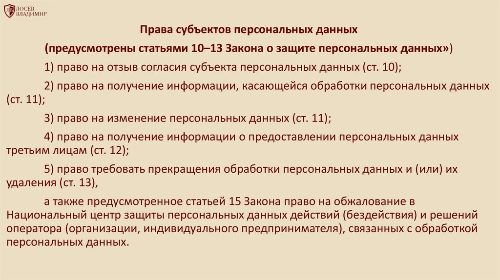 1) право на отзыв согласия субъекта персональных данных (ст. 10);