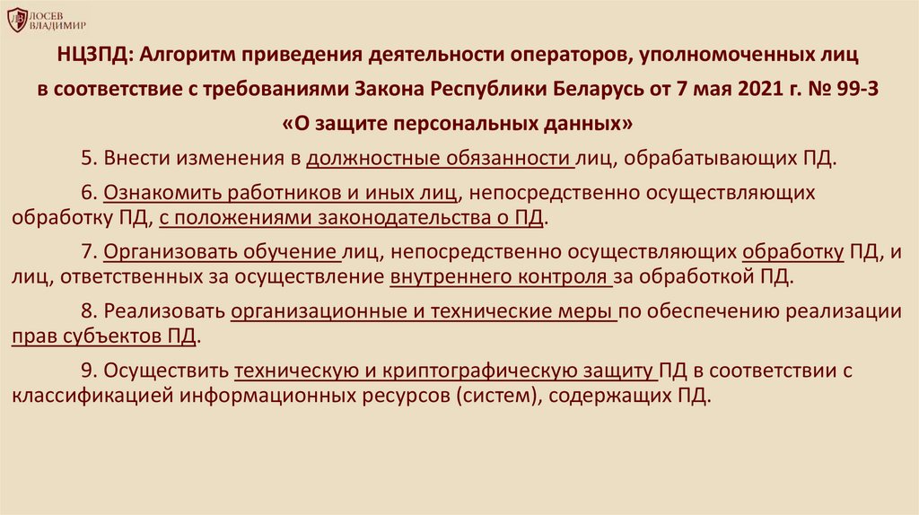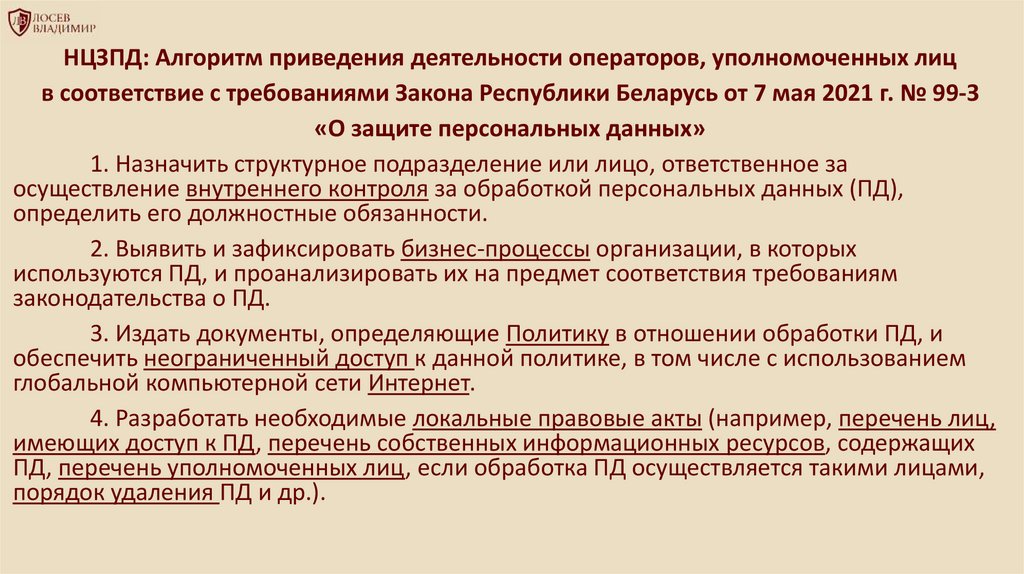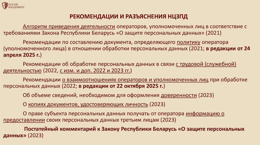 РЕКОМЕНДАЦИИ И РАЗЪЯСНЕНИЯ НЦЗПДАлгоритм приведения деятельности операторов, уполномоченных лиц в соответствие с
