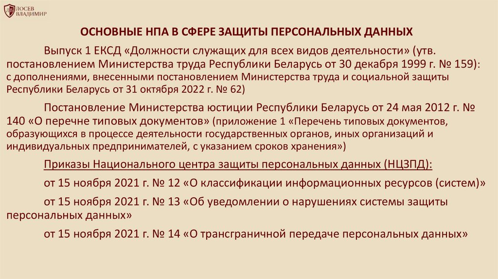 ОСНОВНЫЕ НПА В СФЕРЕ ЗАЩИТЫ ПЕРСОНАЛЬНЫХ ДАННЫХВыпуск 1 ЕКСД «Должности служащих для всех видов деятельности» (утв.