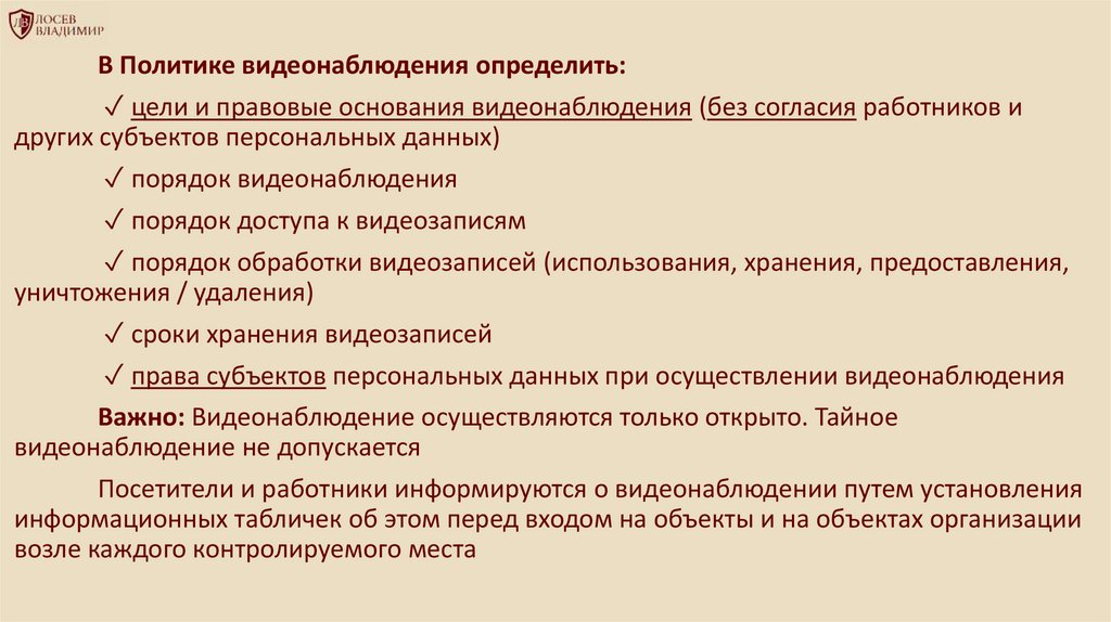 В Политике видеонаблюдения определить:✓ цели и правовые основания видеонаблюдения (без согласия работников и