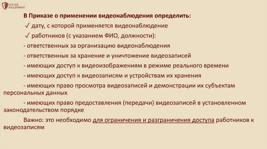 ✓ порядок обработки видеозаписей (использования, хранения, предоставления,
