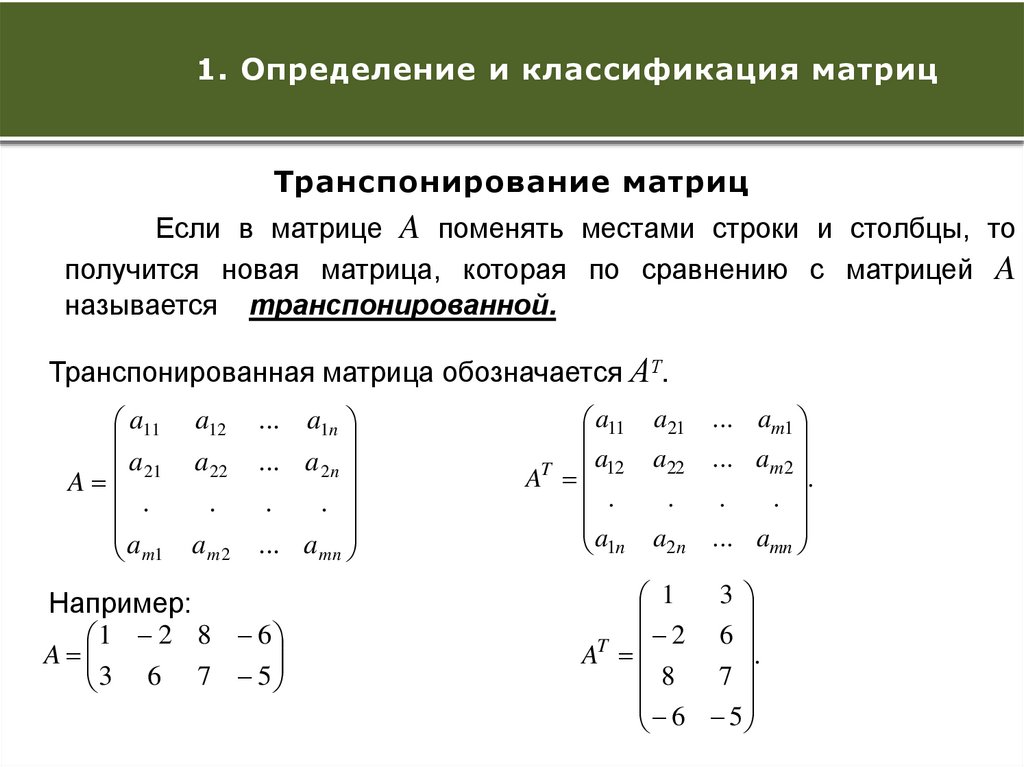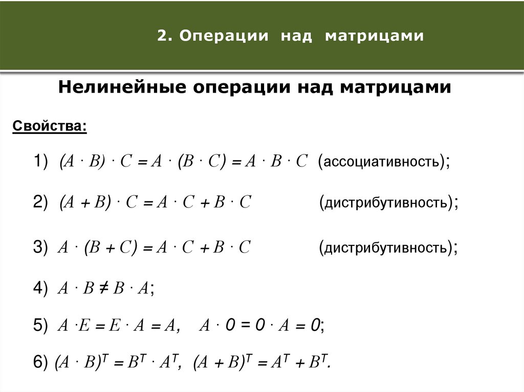 6) (А ∙ В)Т = ВТ ∙ АТ, (А + В)Т = АТ + ВТ.