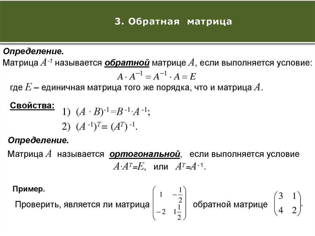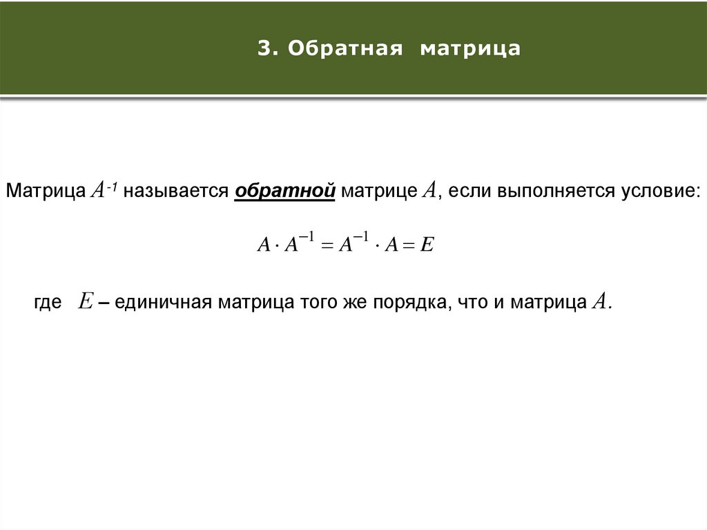 Матрица А-1 называется обратной матрице А, если выполняется условие: