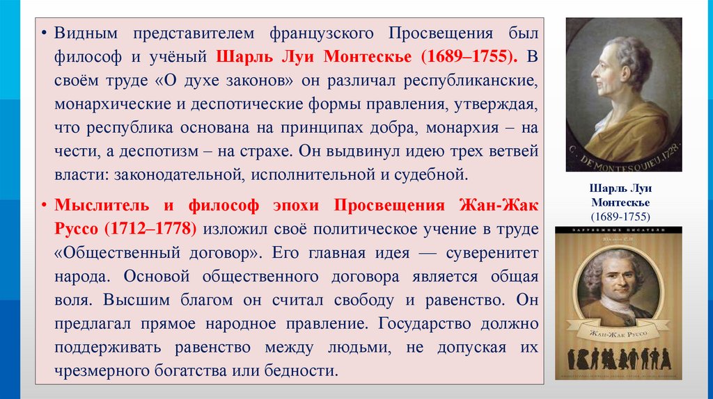 • Видным представителем французского Просвещения былфилософ и учёный Шарль Луи Монтескье (1689–1755). В