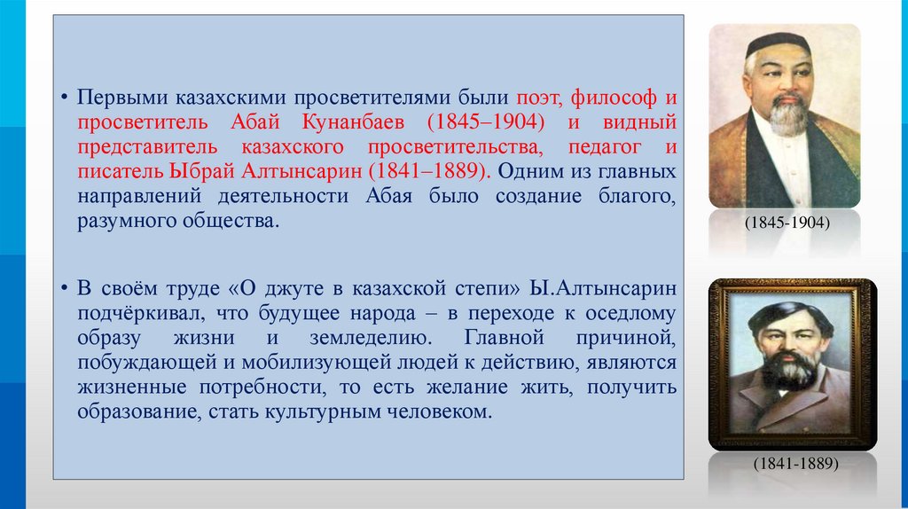 • Первыми казахскими просветителями были поэт, философ ипросветитель Абай Кунанбаев (1845–1904) и видный