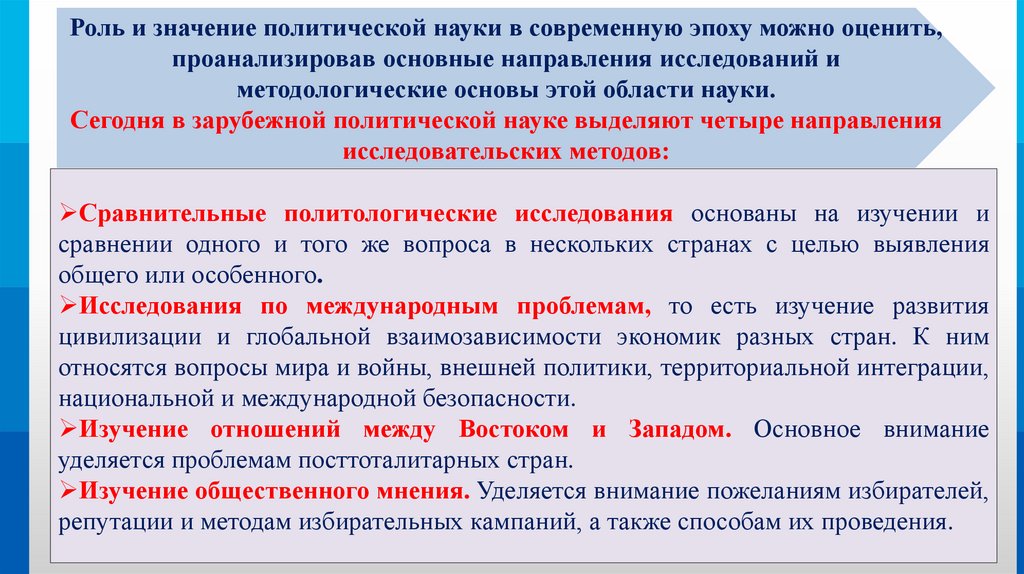 Роль и значение политической науки в современную эпоху можно оценить,проанализировав основные направления исследований и