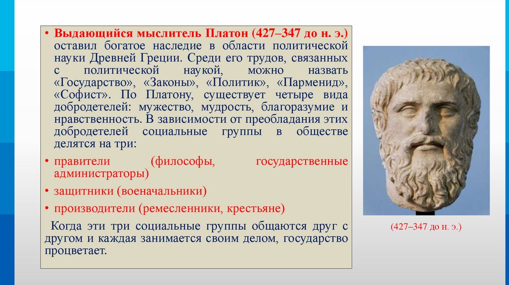 • Выдающийся мыслитель Платон (427–347 до н. э.)оставил богатое наследие в области политической