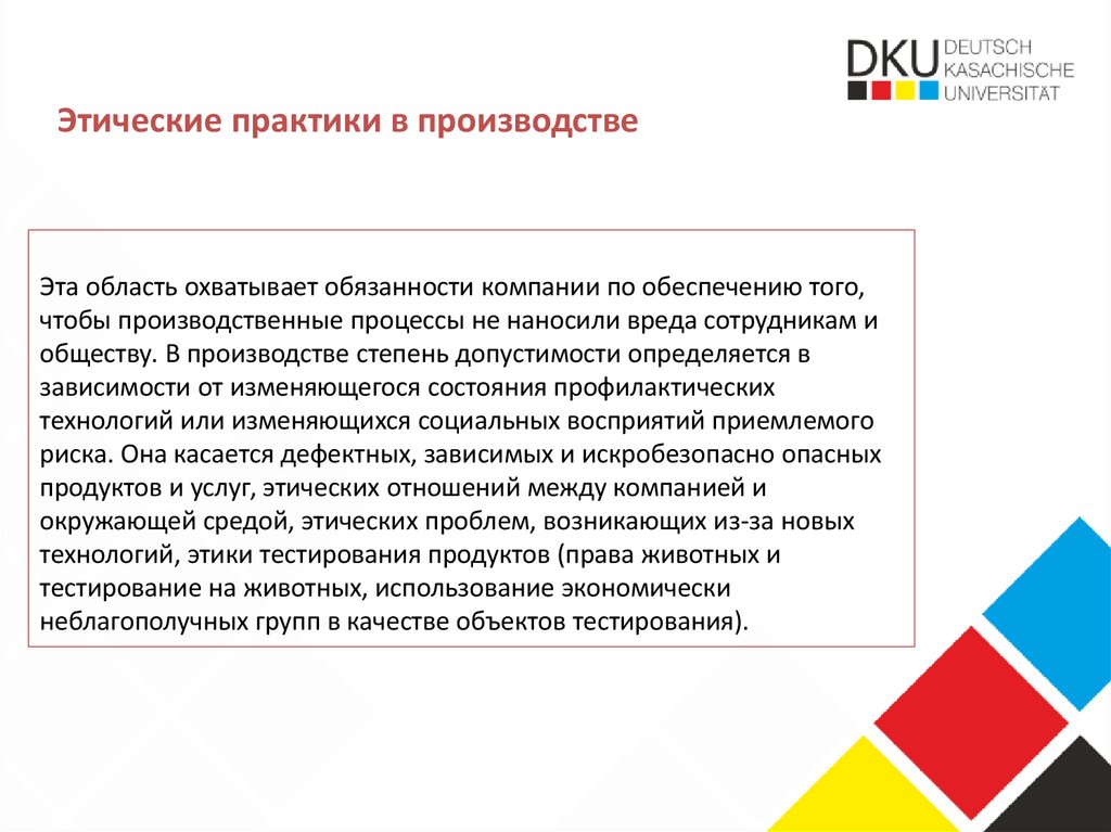 Этические практики в производствеЭта область охватывает обязанности компании по обеспечению того,