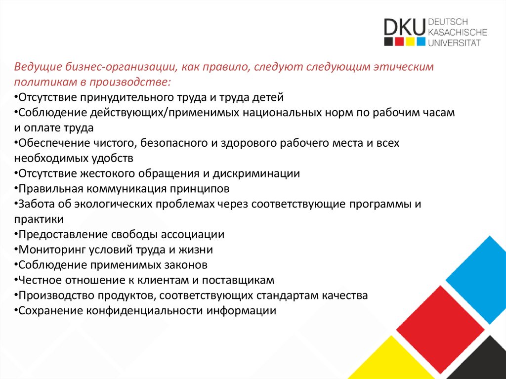 Ведущие бизнес-организации, как правило, следуют следующим этическимполитикам в производстве: