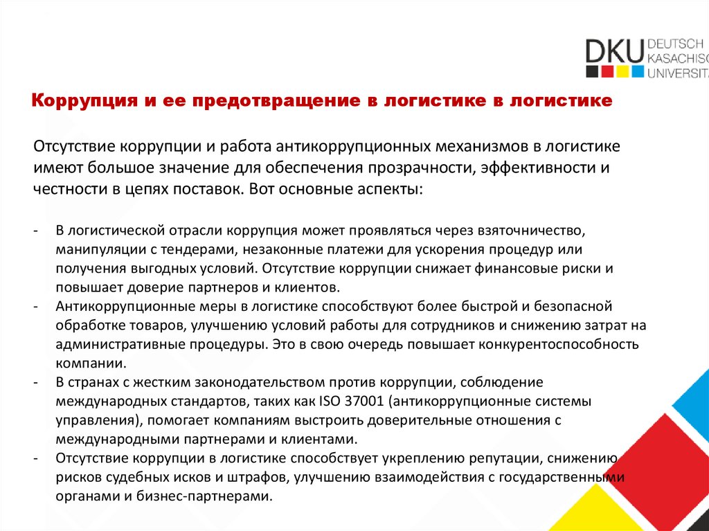Коррупция и ее предотвращение в логистике в логистикеОтсутствие коррупции и работа антикоррупционных механизмов в логистике
