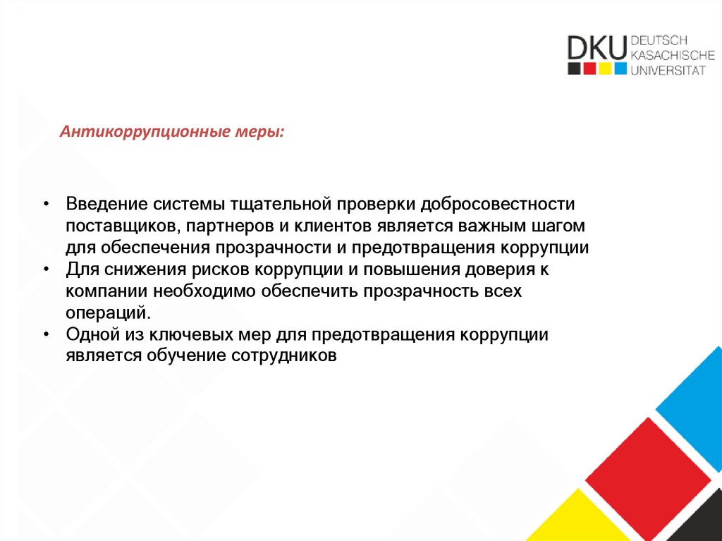 Антикоррупционные меры:• Введение системы тщательной проверки добросовестности