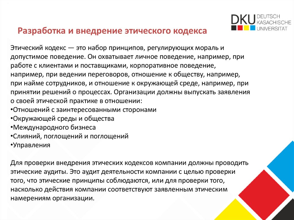Разработка и внедрение этического кодексаЭтический кодекс — это набор принципов, регулирующих мораль и