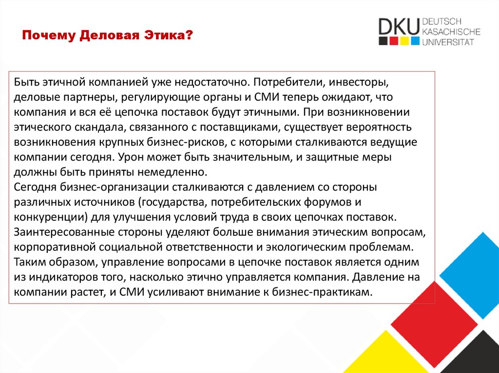 Почему Деловая Этика?Быть этичной компанией уже недостаточно. Потребители, инвесторы,