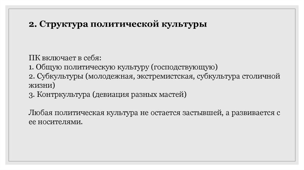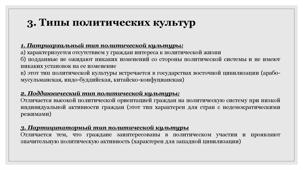 в) этот тип политической культуры встречается в государствах восточной цивилизации (арабомусульманская, индо-буддийская, китайско-конфуцианская)