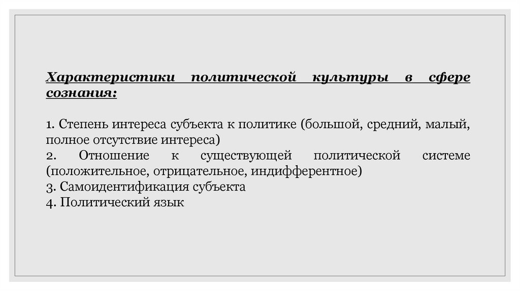 1. Степень интереса субъекта к политике (большой, средний, малый,