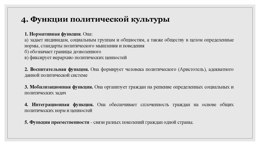 4. Интеграционная функция. Она обеспечивает сплоченность граждан на основе общих