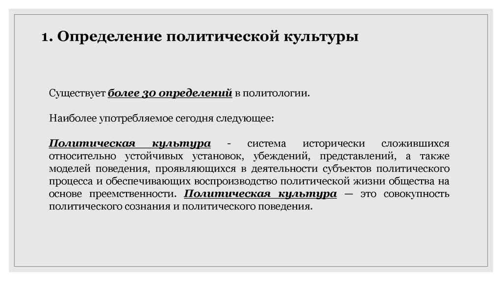 1. Определение политической культурыСуществует более 30 определений в политологии.