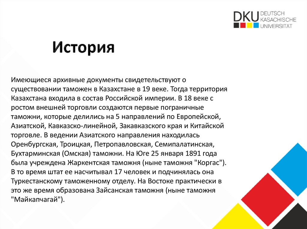 Имеющиеся архивные документы свидетельствуют осуществовании таможен в Казахстане в 19 веке. Тогда территория
