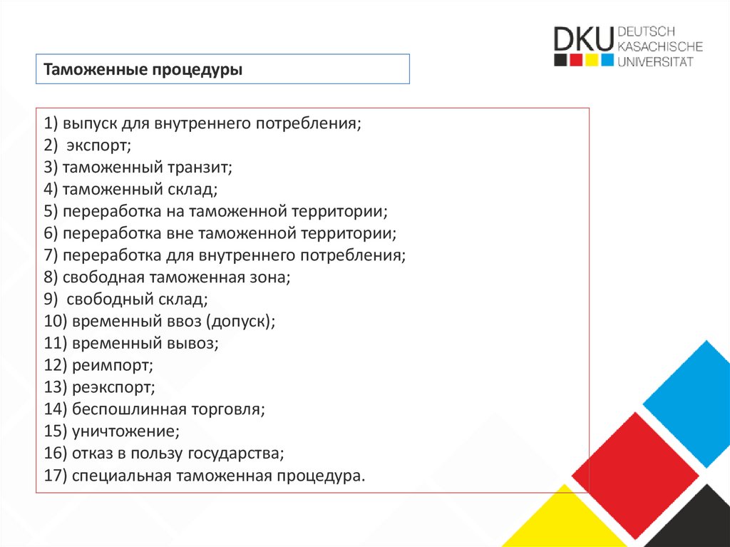 Таможенные процедуры1) выпуск для внутреннего потребления;