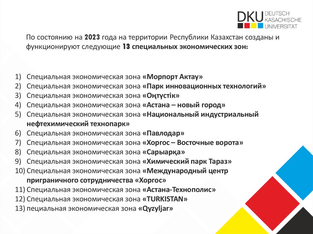 По состоянию на 2023 года на территории Республики Казахстан созданы ифункционируют следующие 13 специальных экономических зон: