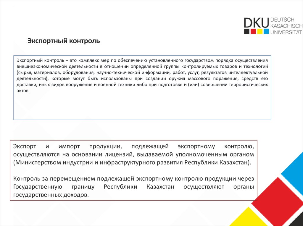 Экспортный контрольЭкспортный контроль – это комплекс мер по обеспечению установленного государством порядка осуществления