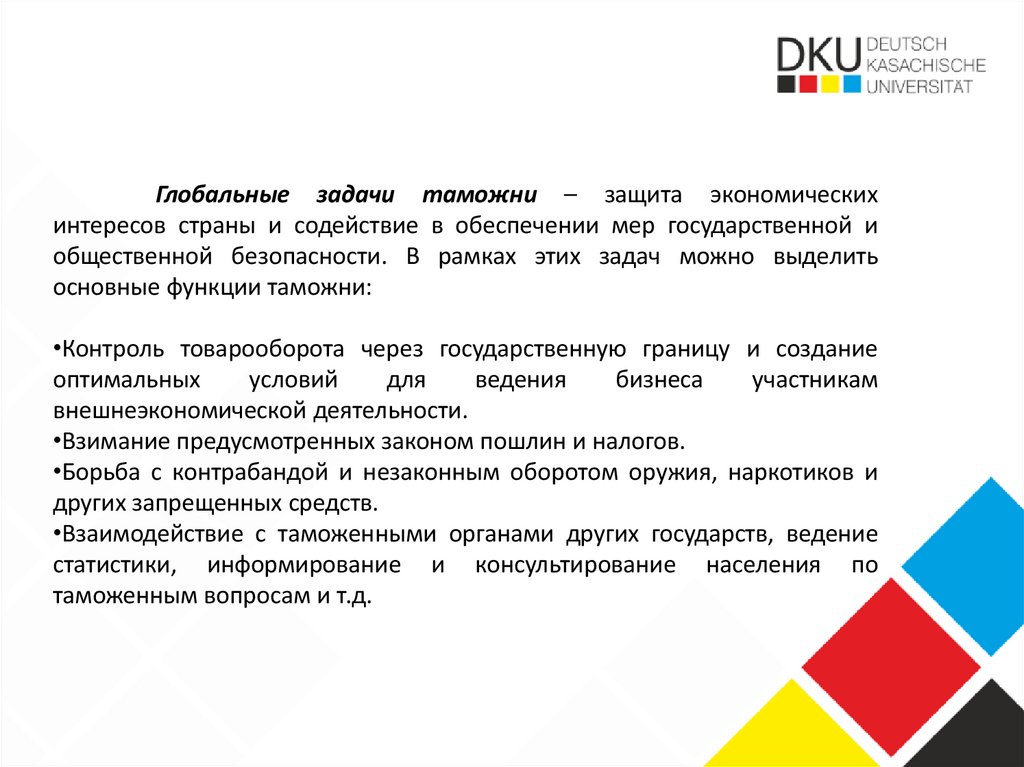 Глобальные задачи таможни – защита экономическихинтересов страны и содействие в обеспечении мер государственной и