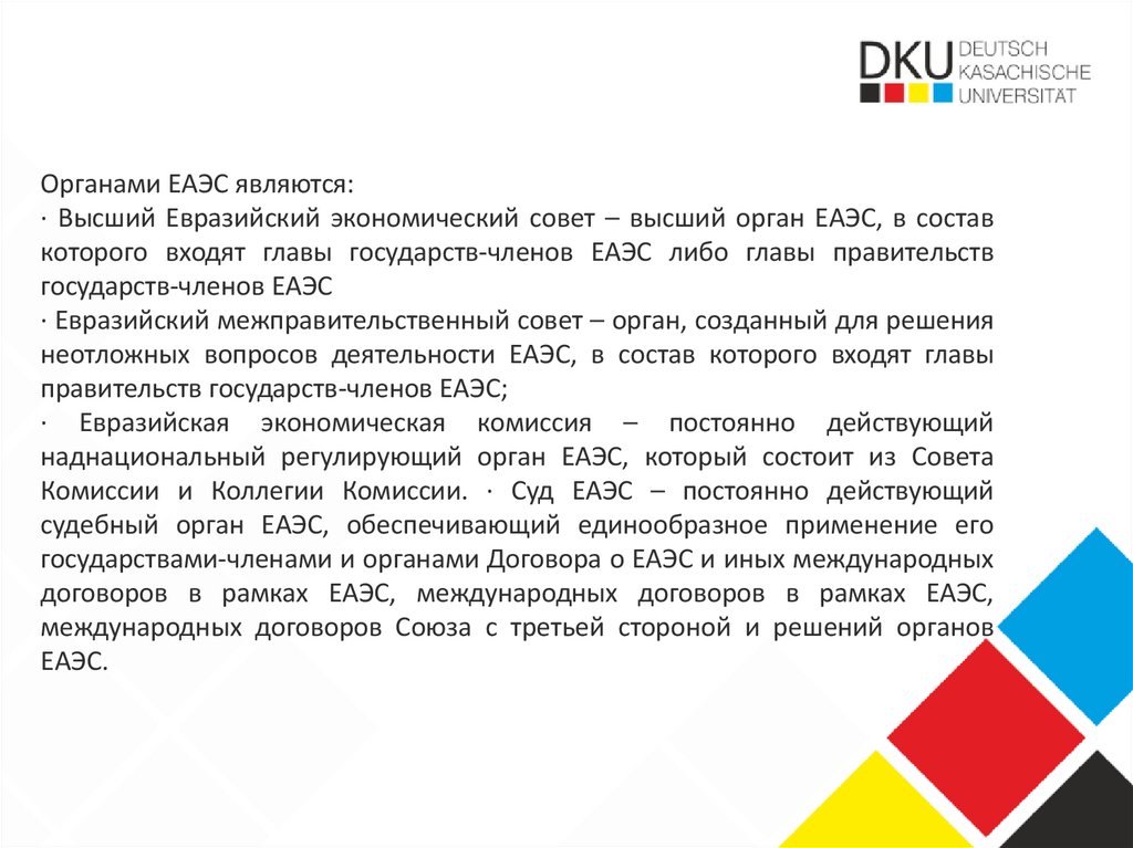 Органами ЕАЭС являются:· Высший Евразийский экономический совет – высший орган ЕАЭС, в состав