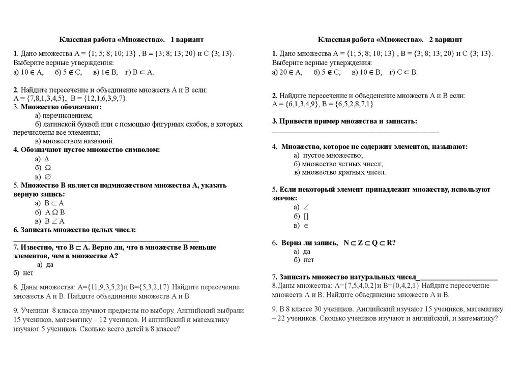 Классная работа «Множества». 2 вариант