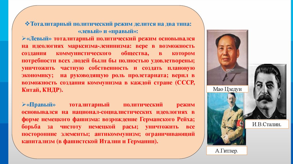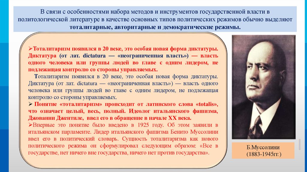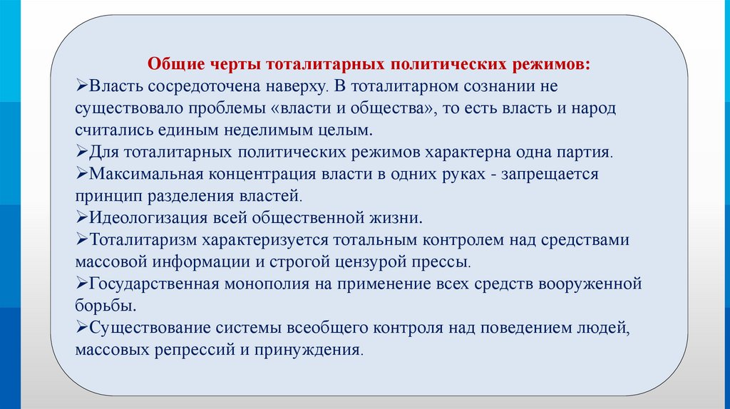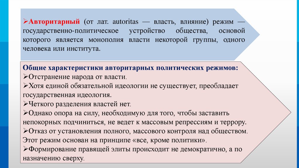 Авторитарный (от лат. autoritas — власть, влияние) режим —государственно-политическое устройство общества, основой