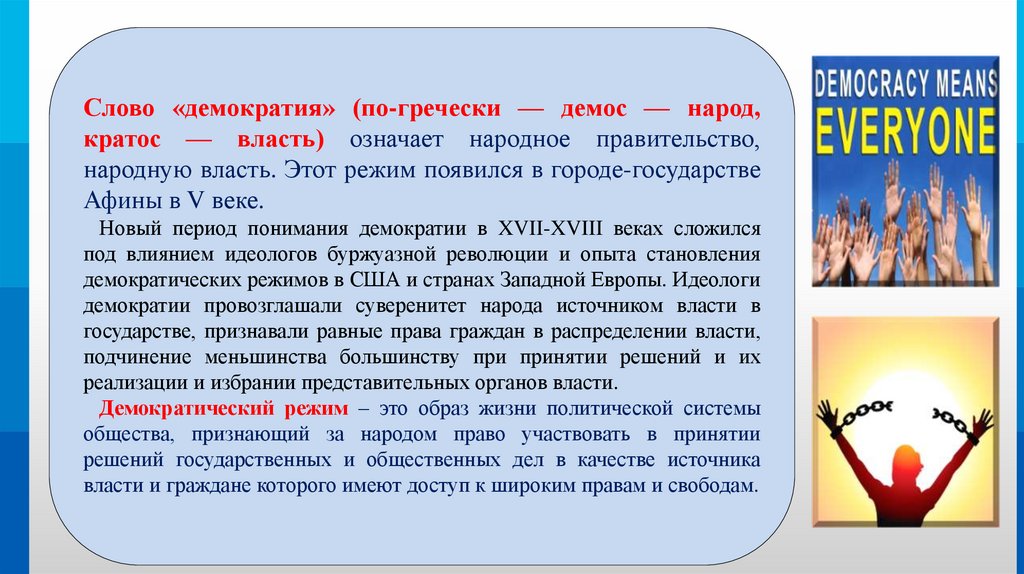 Слово «демократия» (по-гречески — демос — народ,кратос — власть) означает народное правительство,