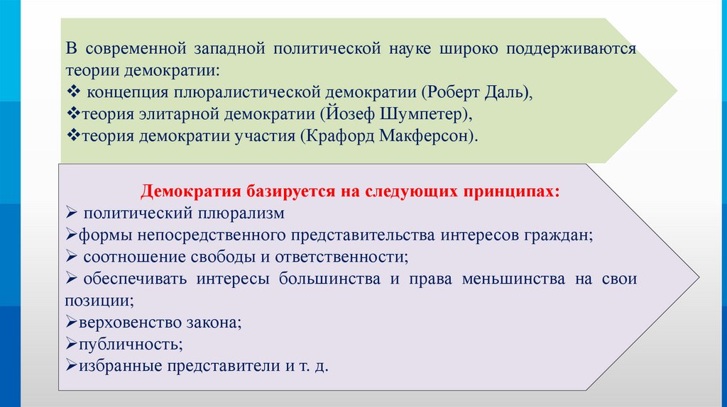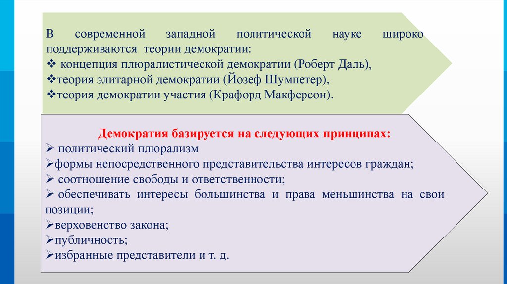 В современной западной политической науке широко поддерживаютсятеории демократии: