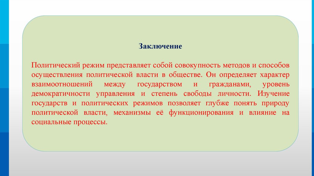 ЗаключениеПолитический режим представляет собой совокупность методов и способов