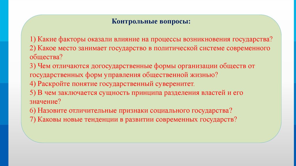 Контрольные вопросы:1) Какие факторы оказали влияние на процессы возникновения государства?