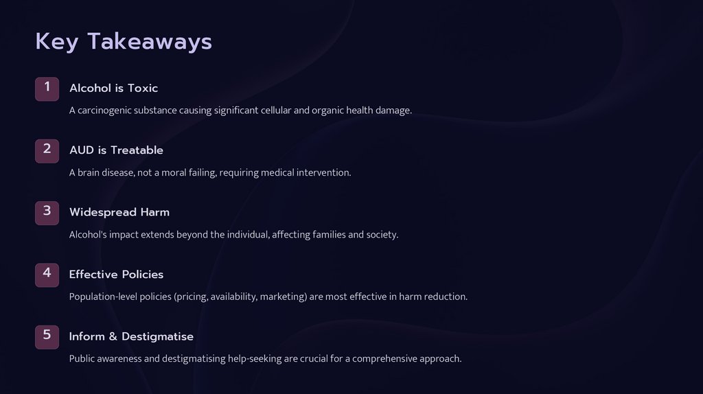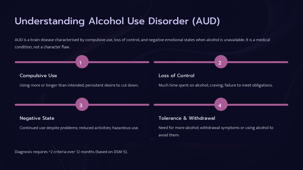 Understanding Alcohol Use Disorder (AUD)AUD is a brain disease characterised by compulsive use, loss of control, and negative emotional states when alcohol is unavailable. It is a medical