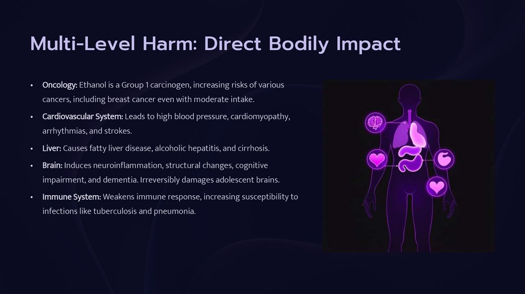 Multi-Level Harm: Direct Bodily ImpactOncology: Ethanol is a Group 1 carcinogen, increasing risks of various