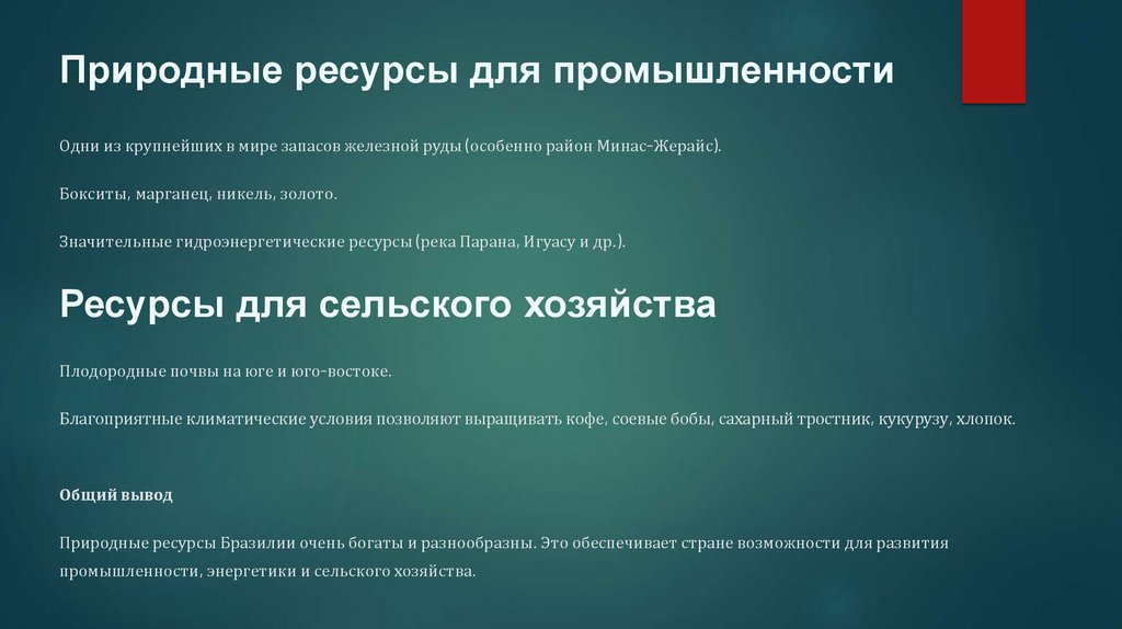 Природные ресурсы Бразилии очень богаты и разнообразны. Это обеспечивает стране возможности для развития